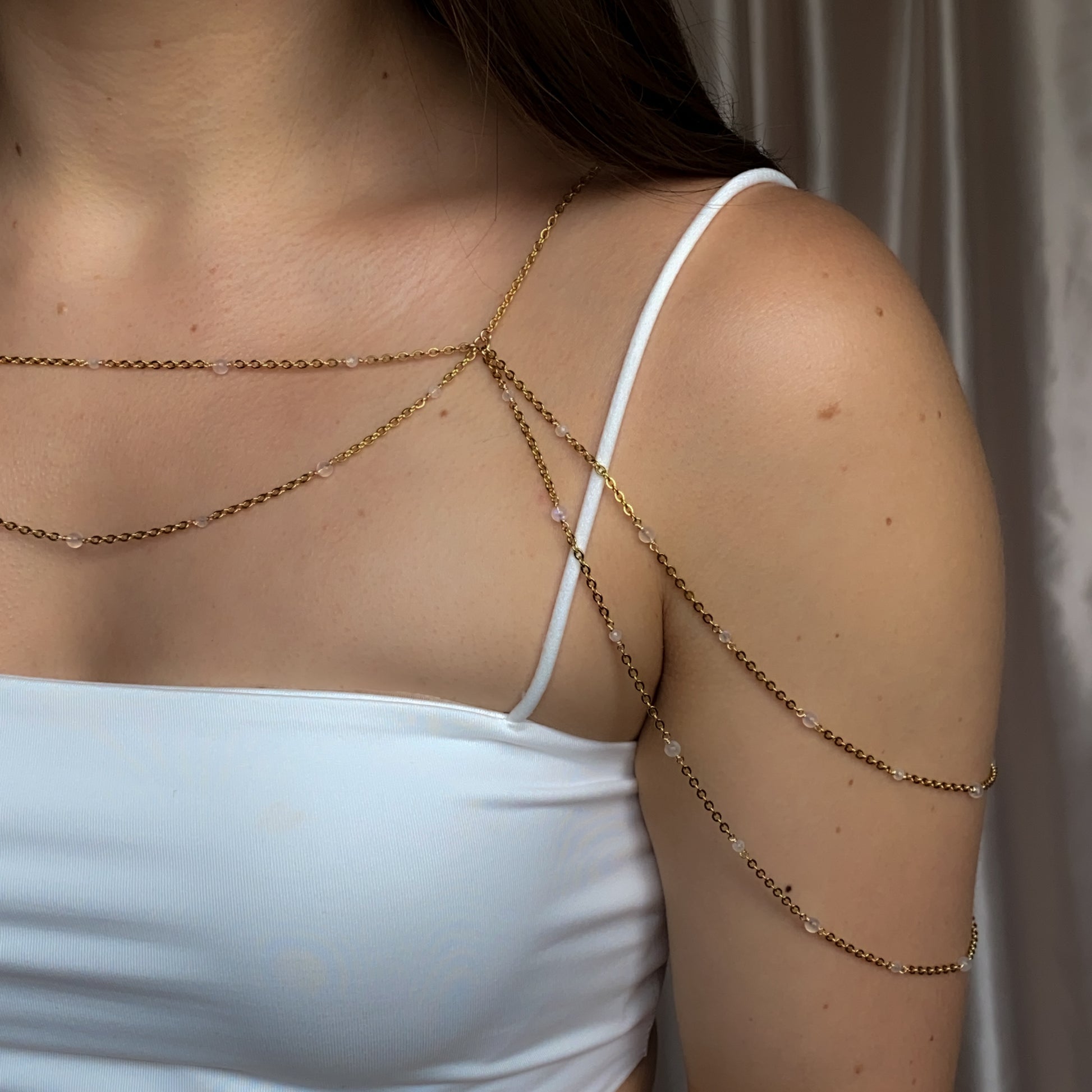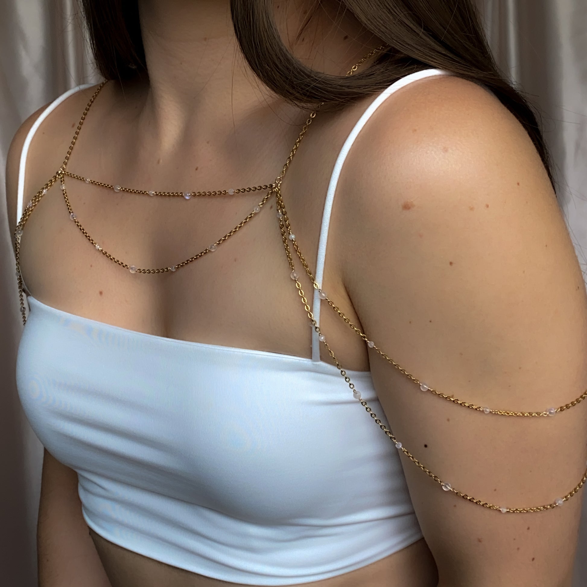 ༺ Shoulder necklace shown on broad shoulders - smaller frames will find the chains drape farther down the shoulders