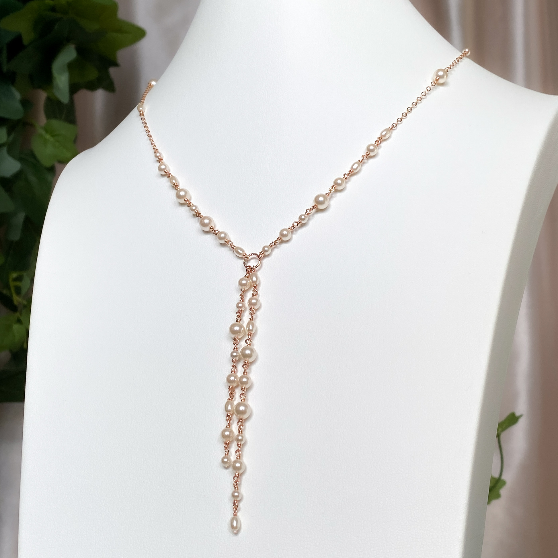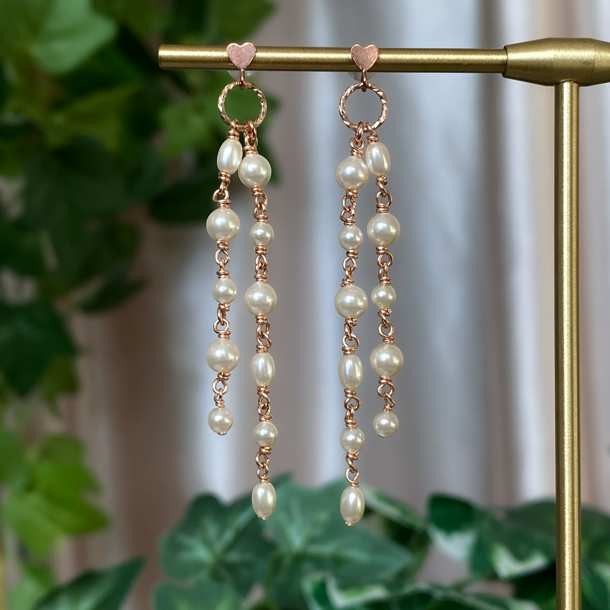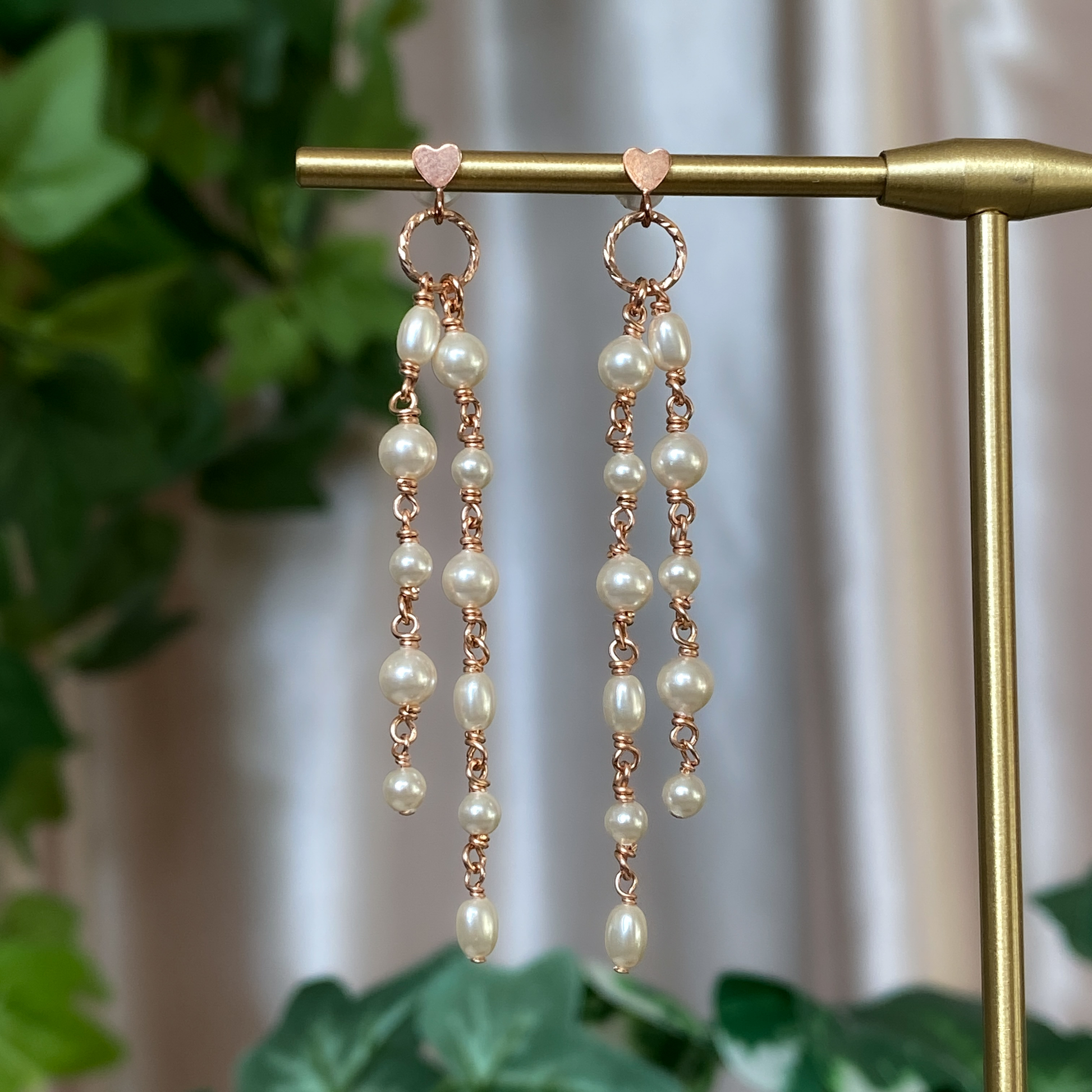 ༺ This listing is for the “Hera” trailing pearl earrings on heart shaped posts in 14k rose gold filled.