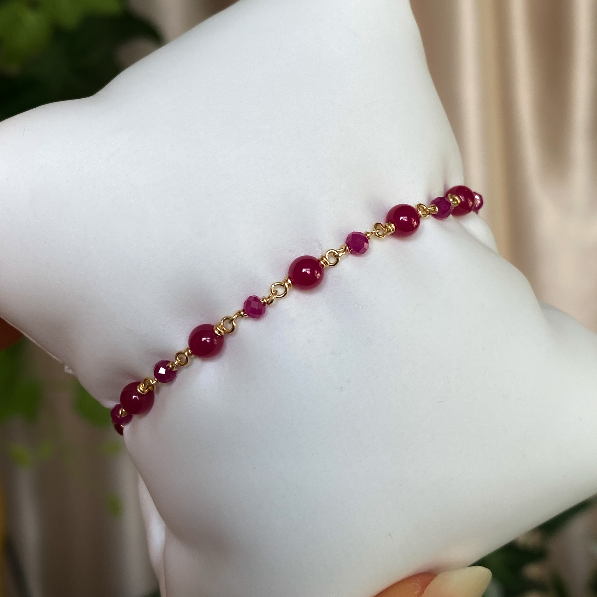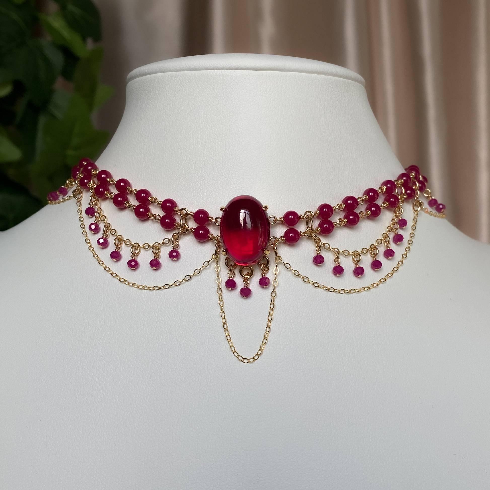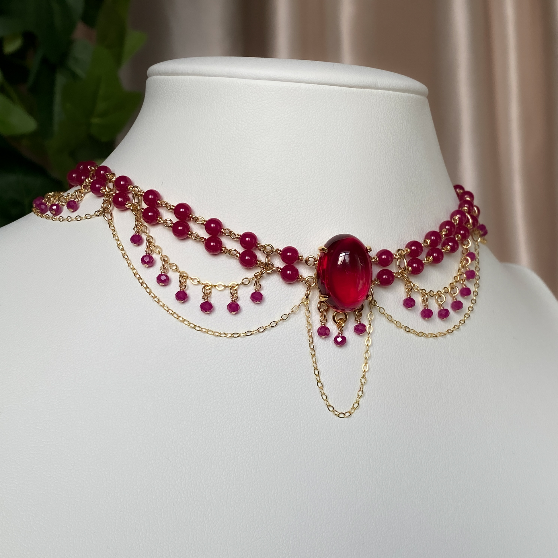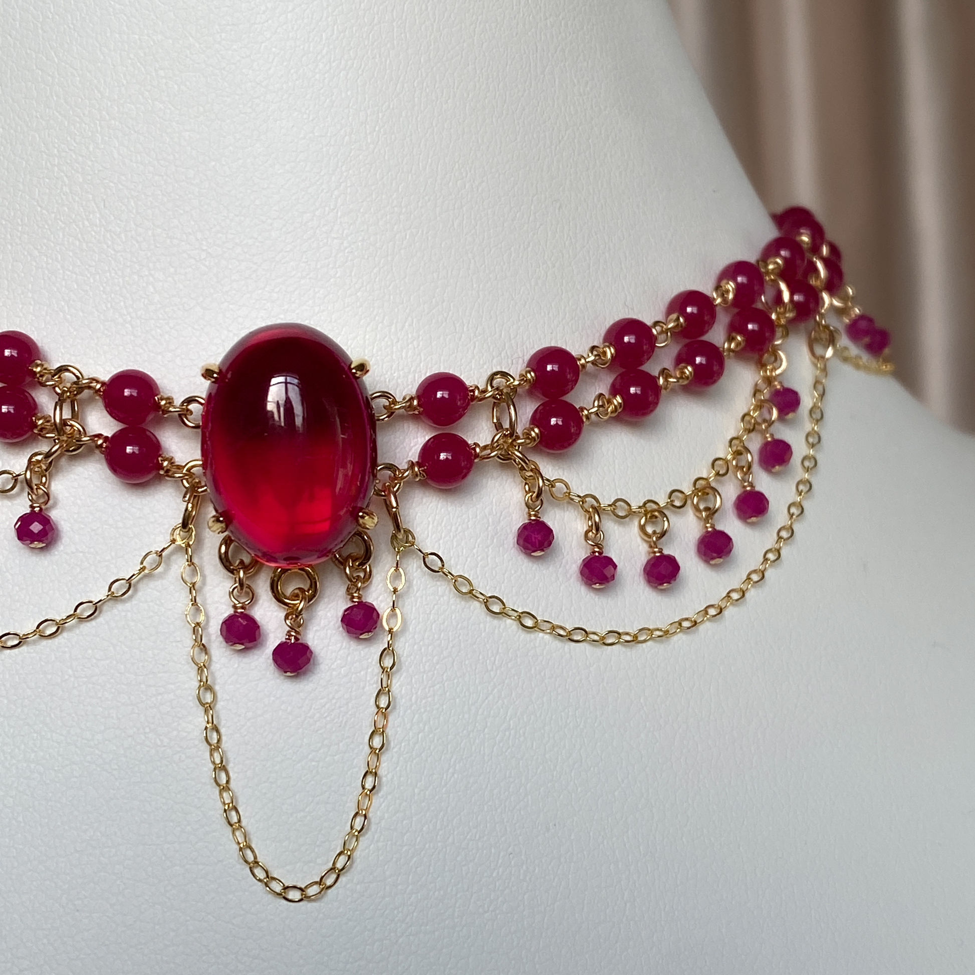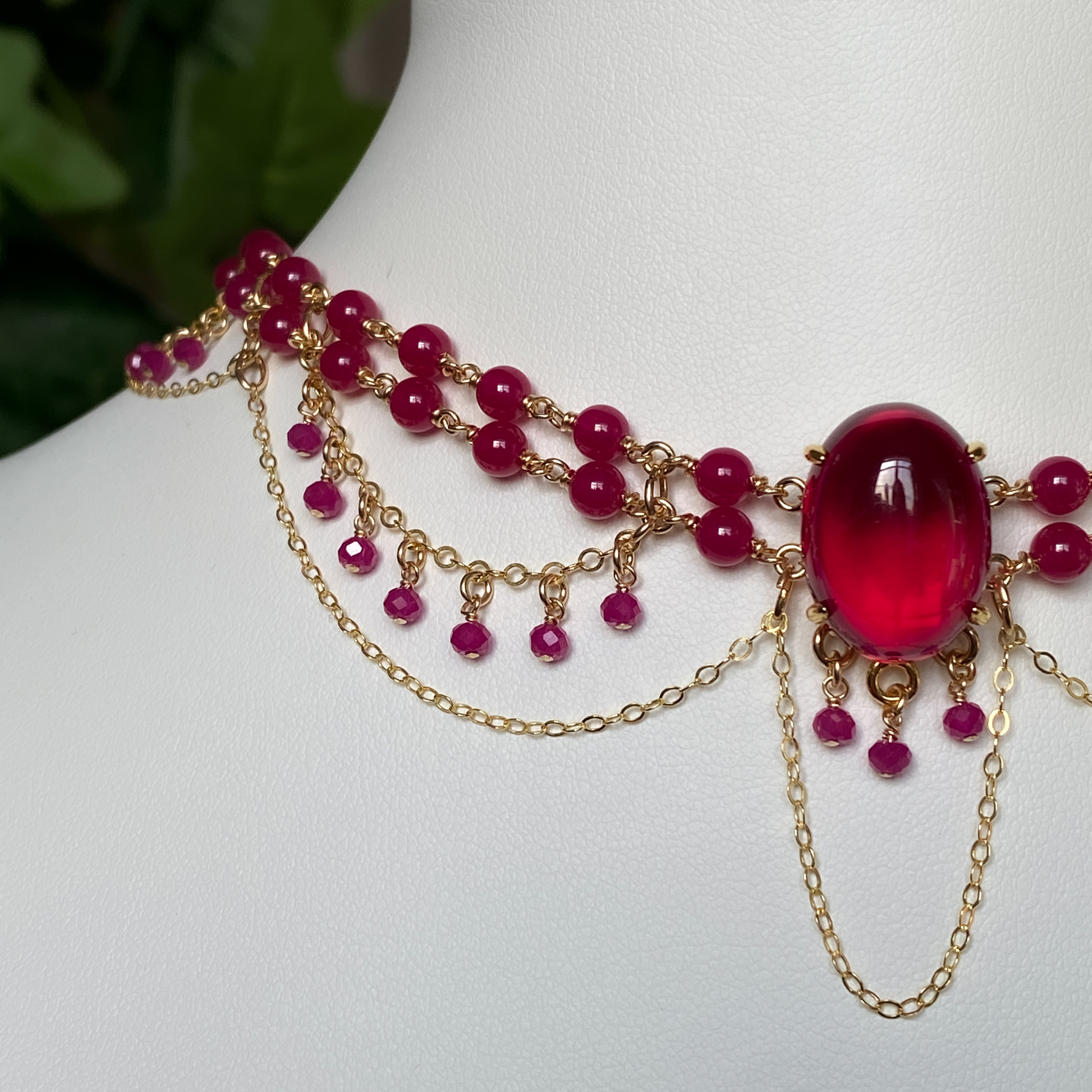 ༺ Materials: ruby beads (synthetic corundum), ruby cabochon (fused ruby ore powder), 14k gold filled.