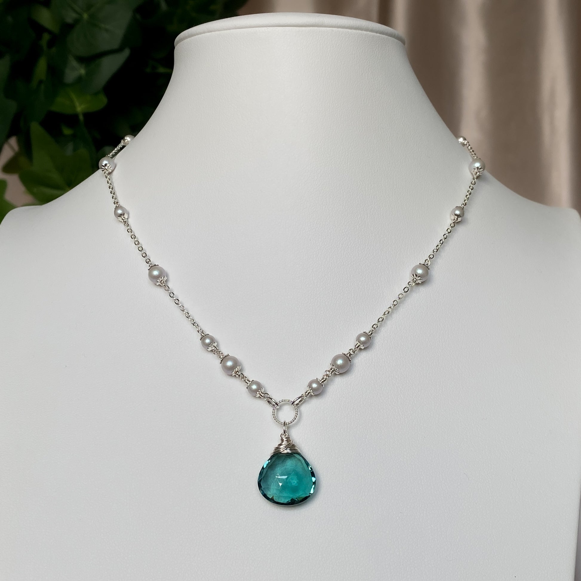 ༺ Materials: iridescent grey crystal pearls, hydro aquamarine quartz, sterling silver