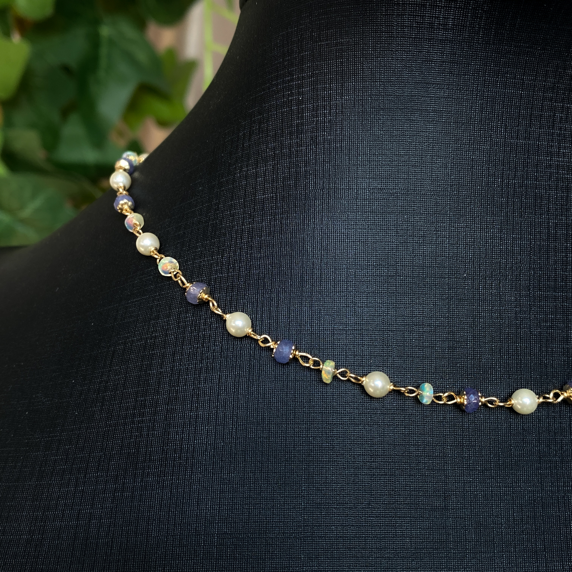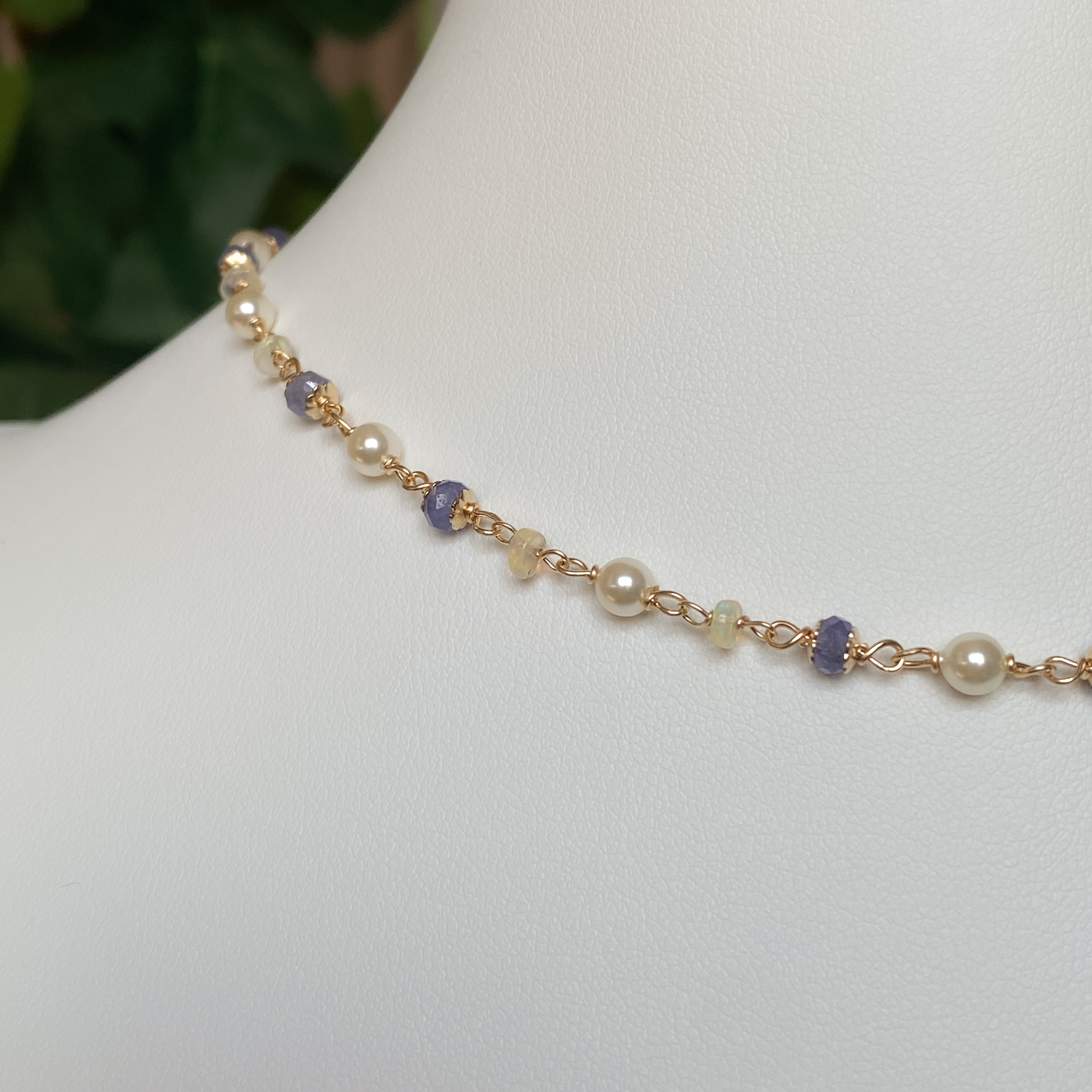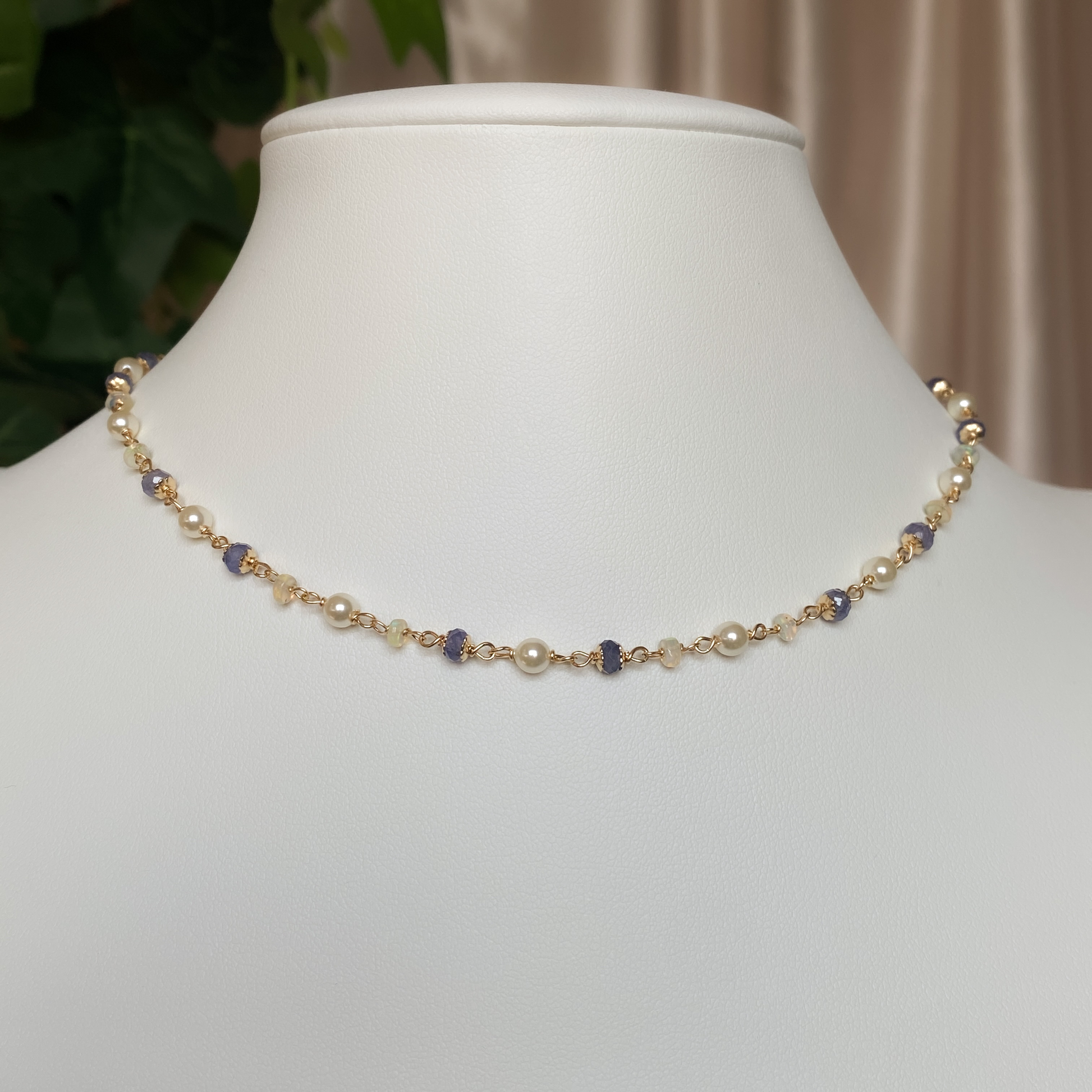 ༺ Materials: crystal pearl, tanzanite, Ethiopian opal, 14k gold filled.